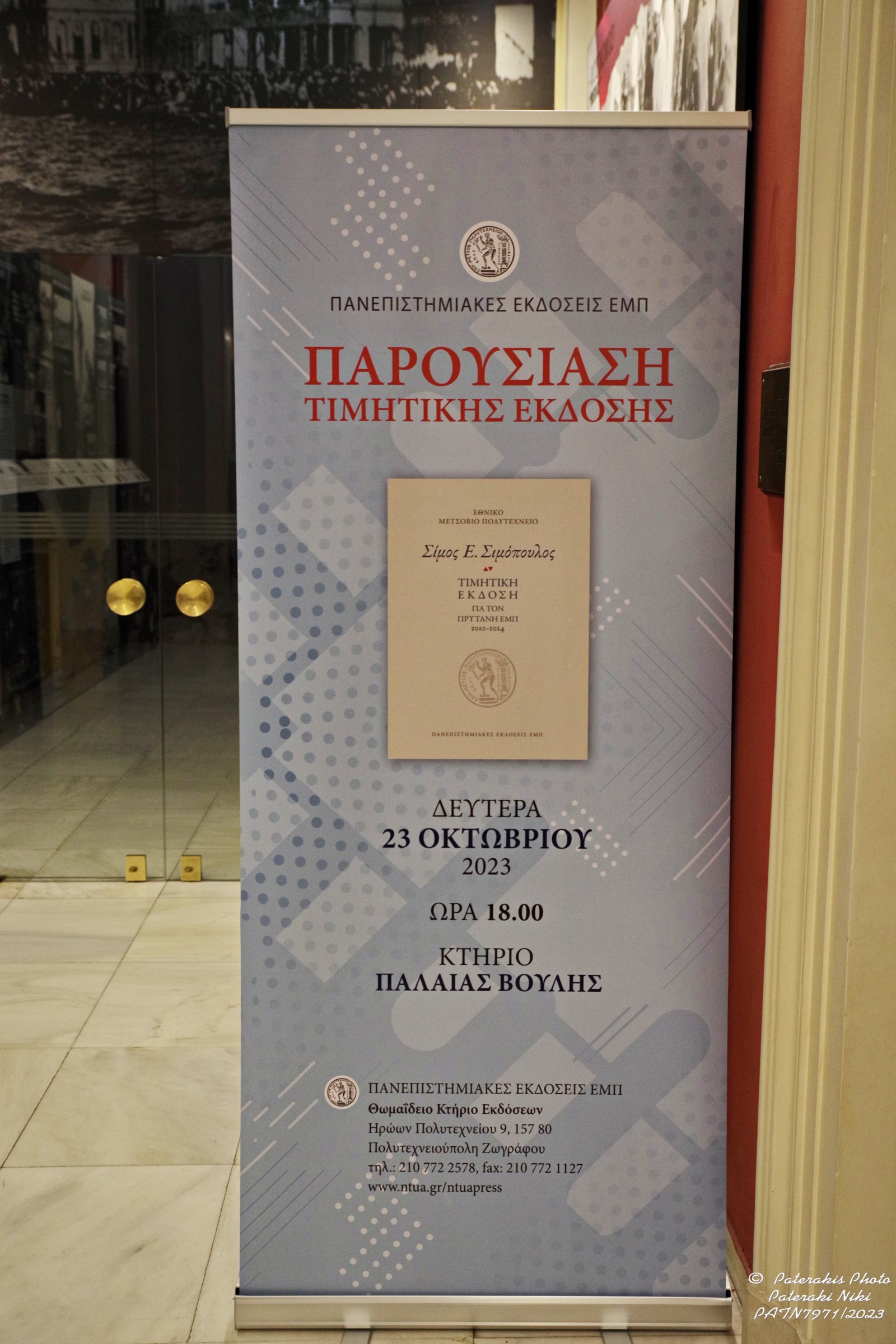 Τη Δευτέρα, 23/10/23, στις 6 μ.μ., πραγματοποιήθηκε με μεγάλη επιτυχία στο κτίριο της Παλαιάς Βουλής η παρουσίαση της Τιμητικής Έκδοσης για τον Πρύτανη του Εθνικού Μετσόβιου Πολυτεχνείου 2010-2014 «Σίμος Ε. Σιμόπουλος», από τις εκδόσεις ΕΜΠ.