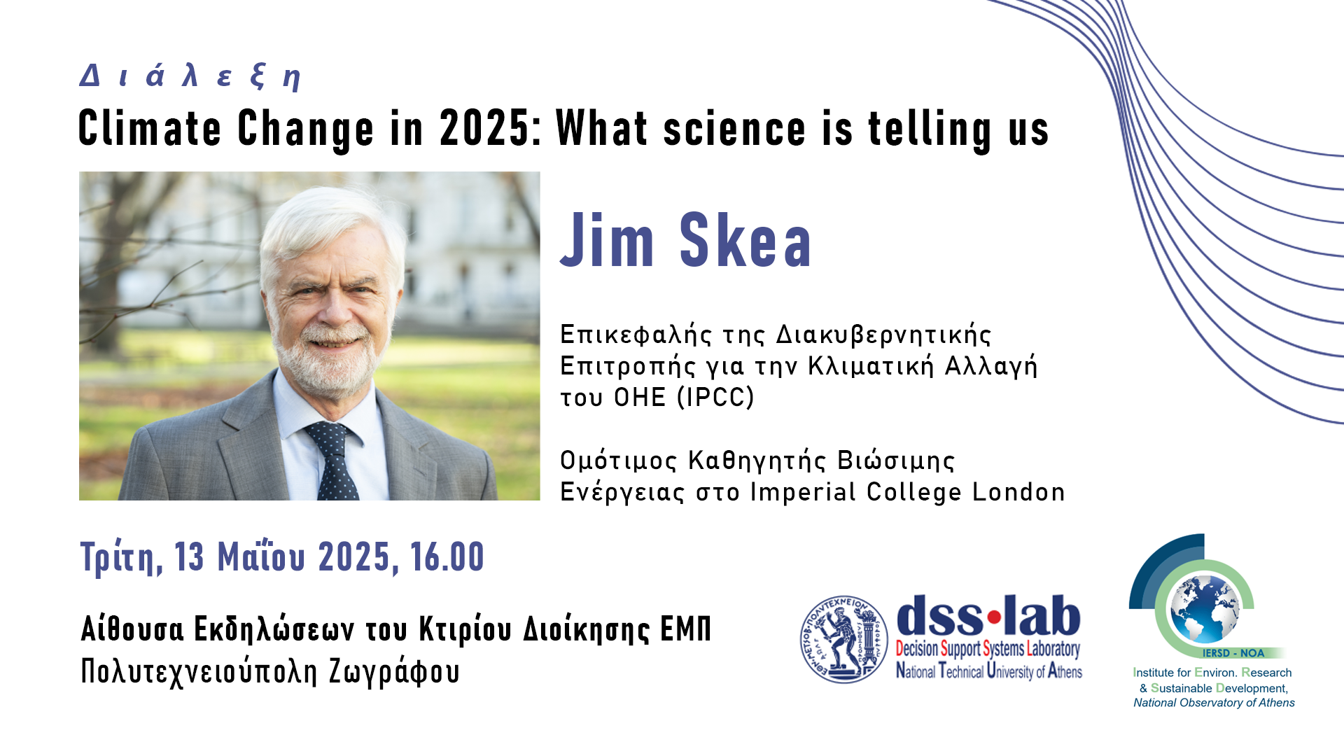 Η Σχολή Ηλεκτρολόγων Μηχανικών & Μηχανικών Η/Υ του Εθνικού Μετσόβιου Πολυτεχνείου (ΣΗΜΜΥ ΕΜΠ) θα έχει την ιδιαίτερη χαρά και τιμή να φιλοξενήσει τον Επικεφαλής της Διακυβερνητικής Επιτροπής για την Κλιματική Αλλαγή του ΟΗΕ (Intergovernmental Panel on Climate Change - IPCC [1]) και Ομότιμο Καθηγητή Βιώσιμης Ενέργειας στο Imperial College London [2], Sir Jim Skea, για μία μοναδική διάλεξη με θέμα "Climate Change in 2025: